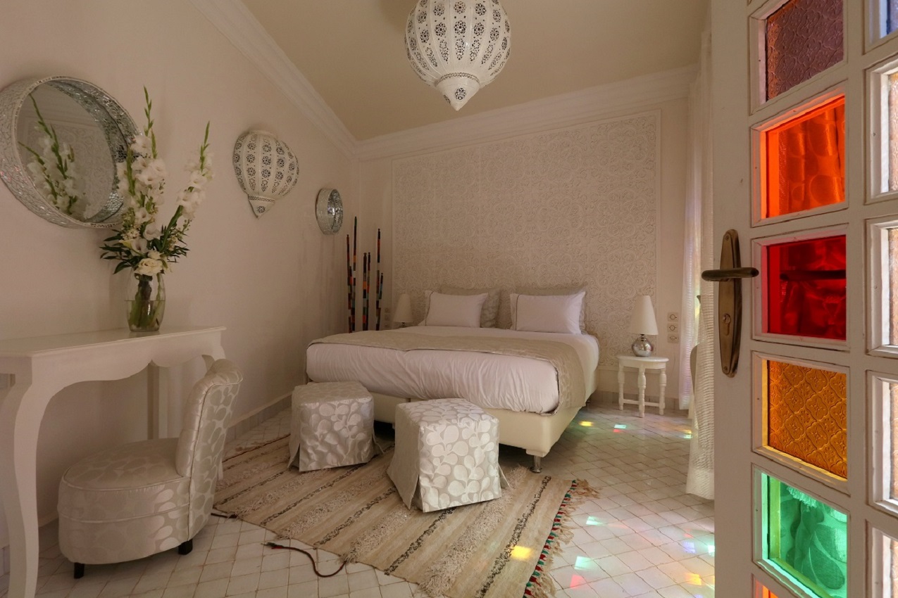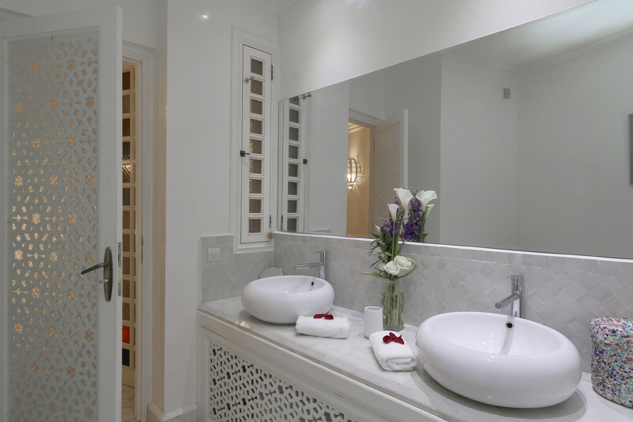 Avec sa décoration dominée par un blanc immaculé, concrétisée par une majestueuse tête de lit en plâtre sculpté, associée à de lumineux murs en stucco blanc (effet miroir) et un sol en zellige blanc émaillé, la chambre Abla inspire à la pureté intimiste et sereine.