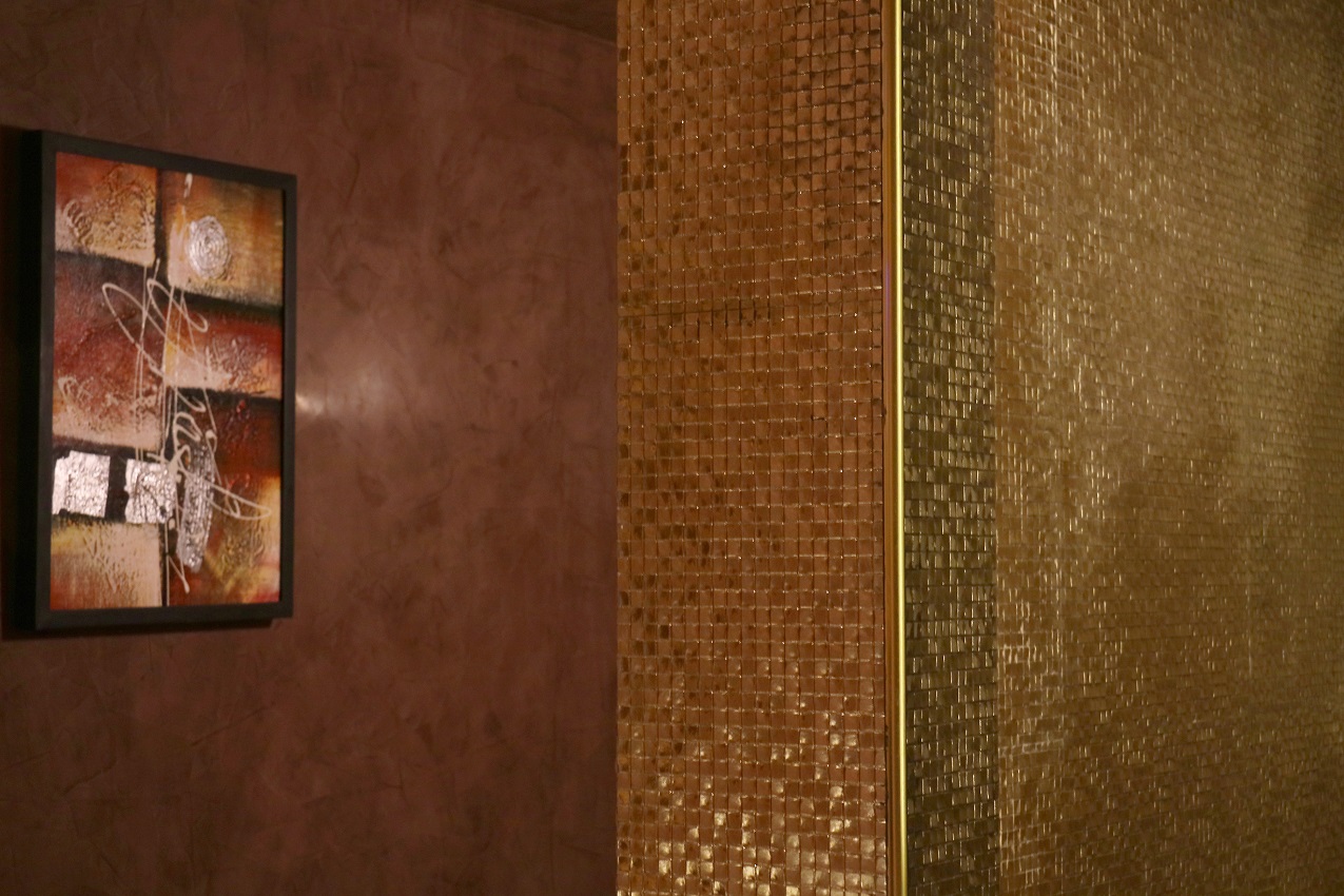 L’alliance raffinée des teintes chocolatées et beiges est accentuée par les stries lumineuses émanant des ciselures cuivrées. Cette union chaleureuse réhaussée par une tête de lit en zellige mordoré en harmonie avec la salle de bains, incite à la rêverie marocaine.